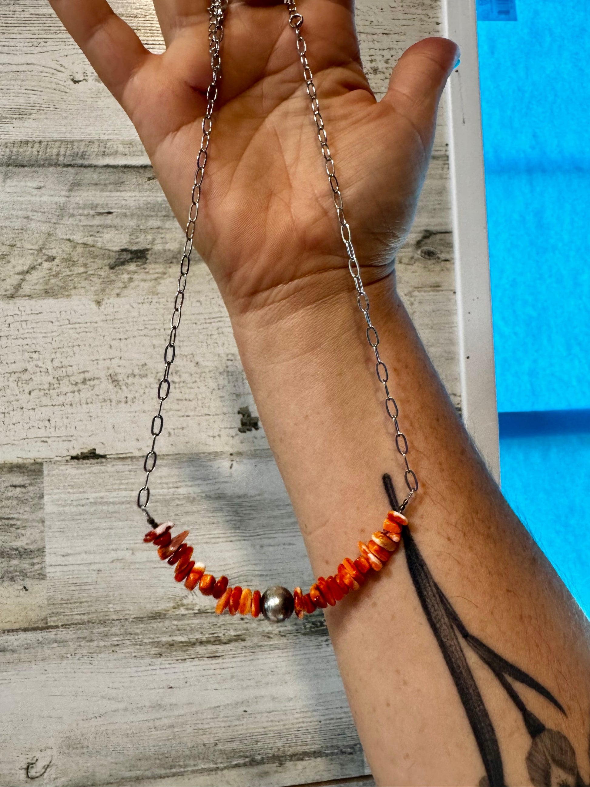 Handmade in the USA by The Bijoux FAB, this 17-inch paperclip chain necklace (plus extender) blends modern style with coastal-inspired charm. Crafted with silver-plated paperclip chain, it features natural spiny oyster chips in warm orange-red tones — each one unique due to the natural shell. At the center sits a bold 10mm sterling silver pearl bead for an elegant finishing touch.